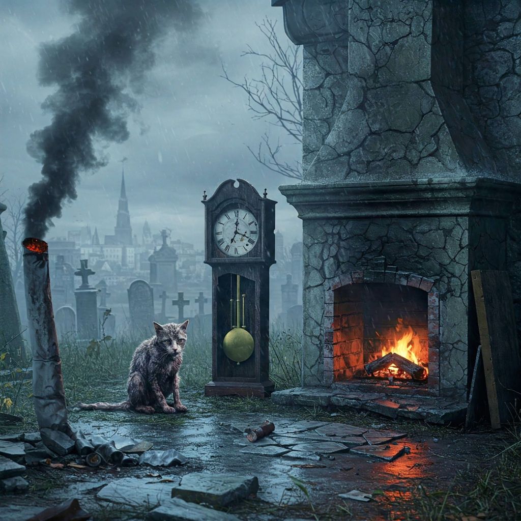A segunda estrofe refere um espaço doméstico, também ele doentio. Dá-se uma mudança de escala, passa-se da cidade para um contexto de maior proximidade, como é indicado pela presença do “meu gato”, “tão magro e sarnento”, que procura refúgio, agitado e sem sossego; ou pela goteira ruidosa, pela sarjeta onde “vagueia … a alma de um poeta” triste. O gato e esta goteira são objetos próximos, indicando um edifício onde o sujeito lírico se encontra, já não tão distante e vago como o aglomerado urbano representado na estrofe anterior. O ambiente descrito mantém a sua característica doentia, de sofrimento e de morte. O gato escanzelado está visivelmente enfermo e, da goteira ,o som que se ouve é triste, frio, fantasmagórico: “Vagueia pela goteira a alma de um poeta / Com a sua triste voz de fantasma friorento. //”. A sensação de estranheza e solidão do poema é amplificada.